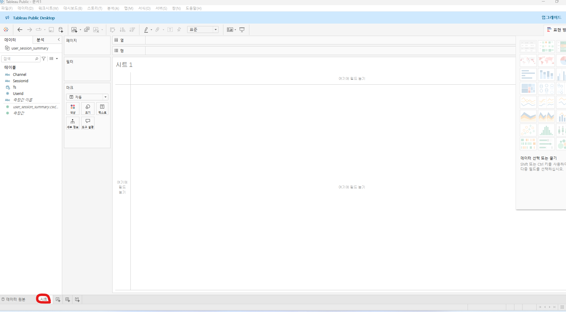 빨간 동그라미인 시트1을 누르면 이렇게 화면이 바뀌는데, 여기서 대시보드 생성 가능