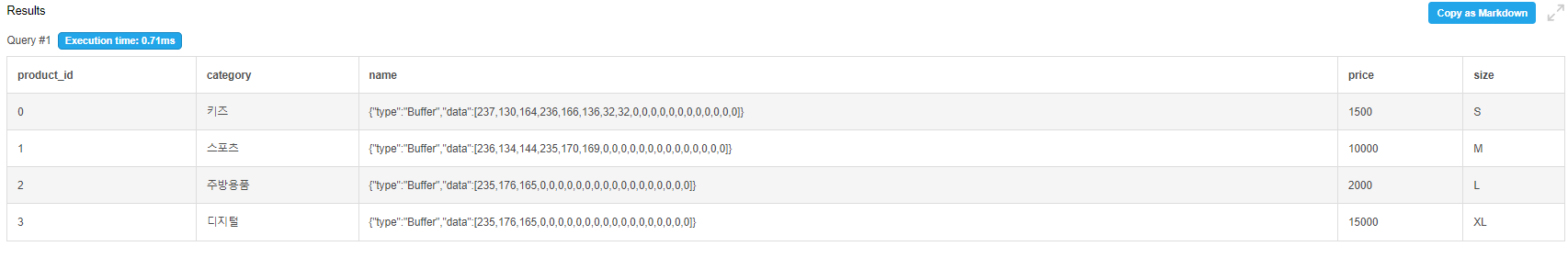 INSERT INTO `products` (`product_id`, `category`, `name`, `price`, `sales_yn`) VALUES