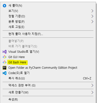3. github에 올릴 코드가 있는 폴더로 이동하여 마우스 오른쪽 버튼을 누르고 Git Bash Here 클릭