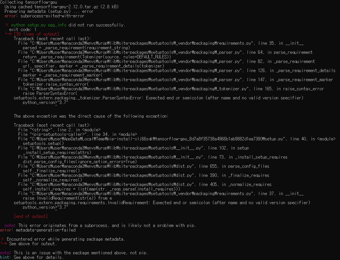 pip로 tensorflow-gpu를 다시 설치할 때 아래와 같은 오류가 발생했다.