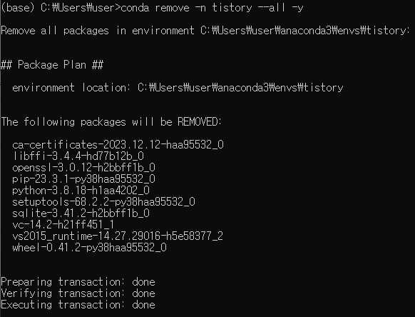 예시) conda remove -n tistory --all -y