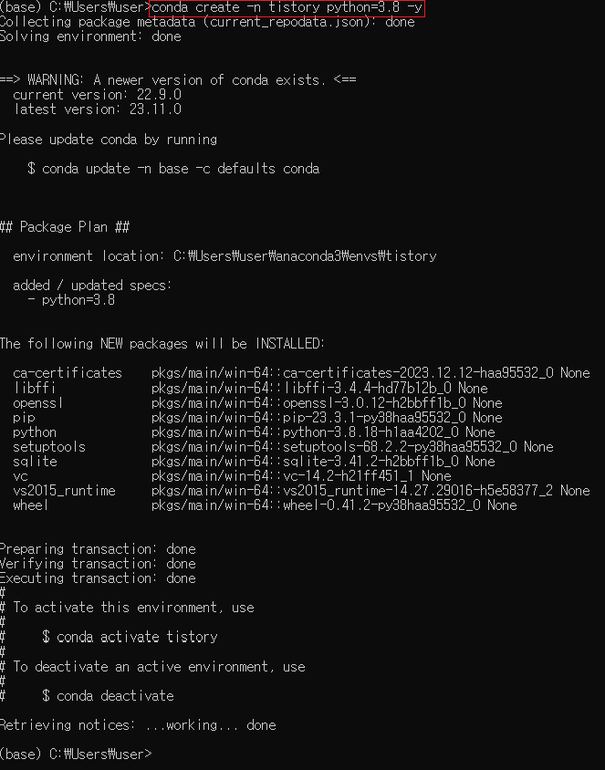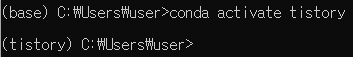 가상환경 활성화 후 (base)에서 (tistory)로 바뀐 모습을 볼 수 있다.