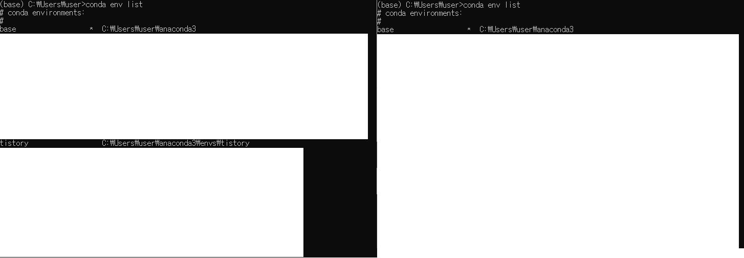 가상환경 이름을 모두 가려 잘 보이진 않지만, 오른쪽 사진에서 프롬프트 창이 조금 더 작은 걸 볼 수 있다.