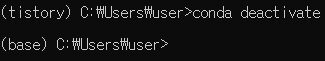 가상환경 비활성화 후 (tistory)에서 (base)로 바뀐 모습을 볼 수 있다.