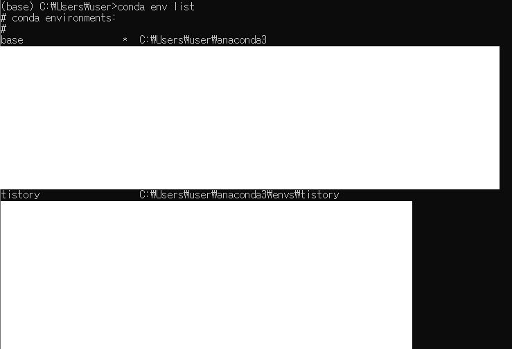 마지막으로 conda env list 명령어를 통해 제대로 지워졌는지 확인
